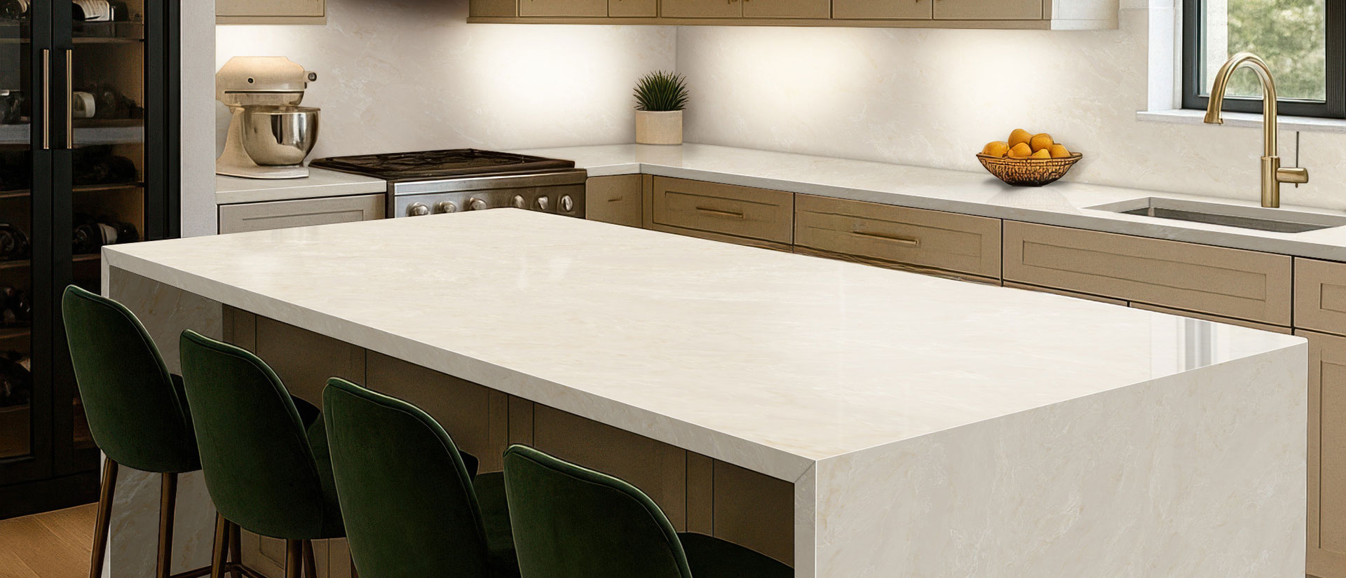 Warm and effortlessly refined, AuraTaj draws inspiration from the beauty of natural Taj Mahal quartzite, offering a timeless aesthetic with modern resilience. A soft cream background is delicately layered with wisps of gold and blonde veining, creating gentle movement and luminous depth across the surface. Ideal for countertops, waterfall islands, and full-height backsplashes, AuraTaj brings a sense of quiet luxury to any space. Available in 2 cm and 3 cm slabs, this quartz is engineered for lasting performance—resistant to scratches, chips, and stains while requiring minimal maintenance.