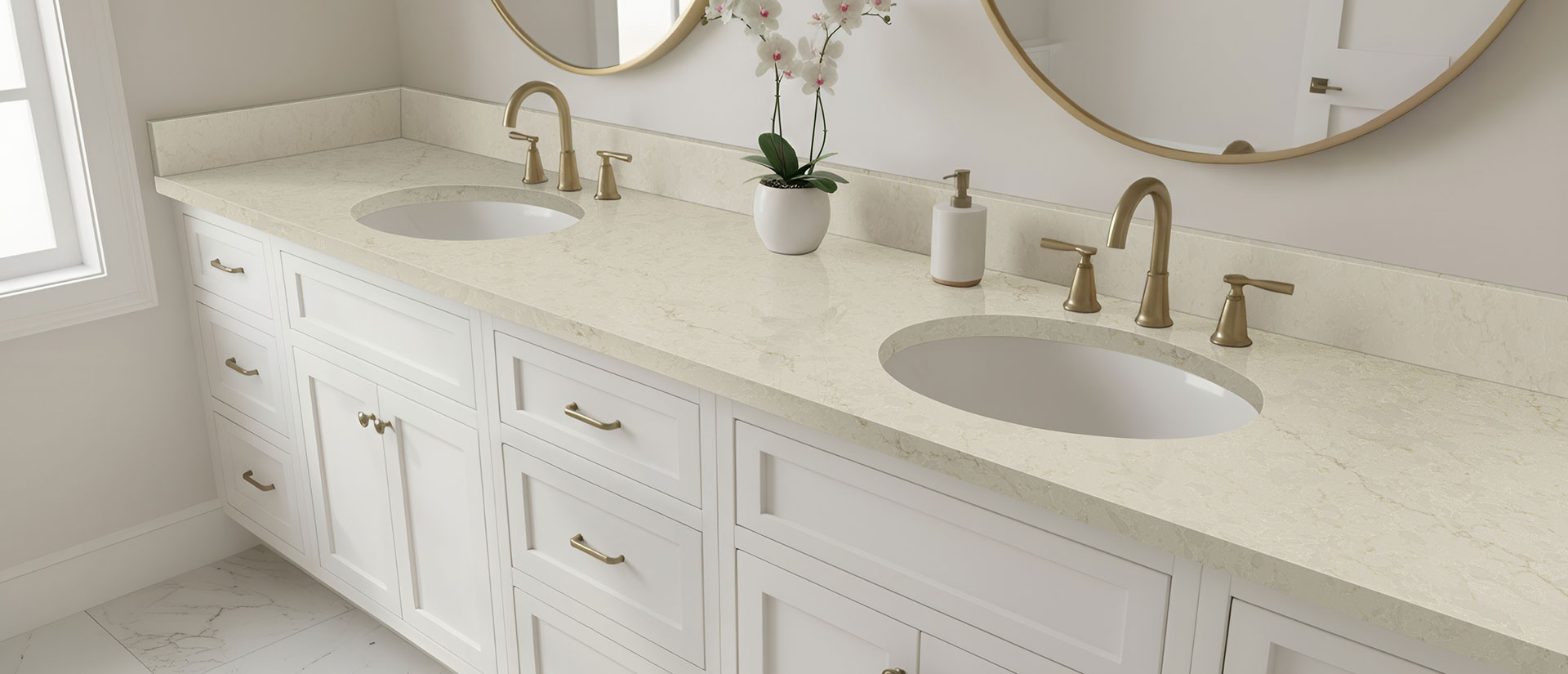MarfiTaj™ effortlessly captures the inspired beauty of the highly sought-after Taj Mahal quartzite with its soft ivory background and long, wispy gold and blonde veins that flow gracefully across the surface. This versatile color delivers the luxurious look of natural stone, pairing beautifully with both light neutrals and rich colors and bringing warmth, poise, and enduring style to any space.
