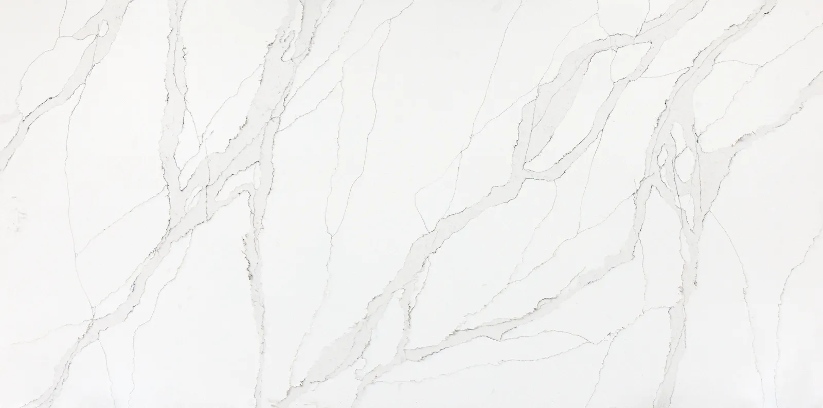 Calacatta marble-inspired quartz, featuring a white background with dynamic light grey and taupe veining.