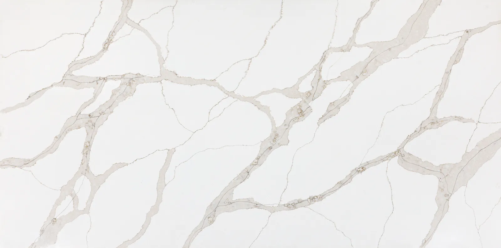 Calacatta marble-inspired quartz, featuring a white background with bold, dynamic gold and grey veining.