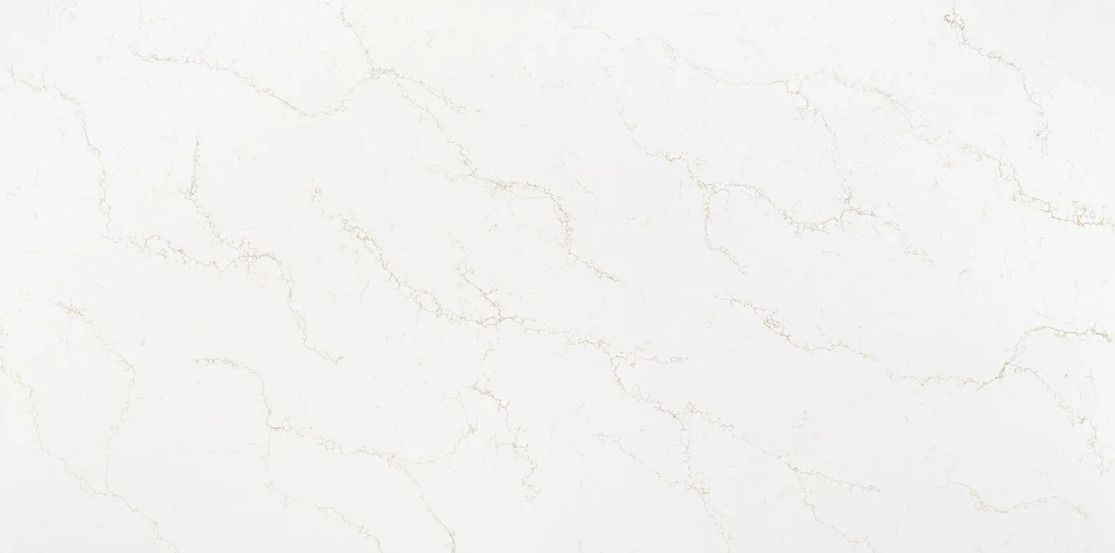 Marble-inspired quartz, featuring a bright white background with flowing light brown veining.