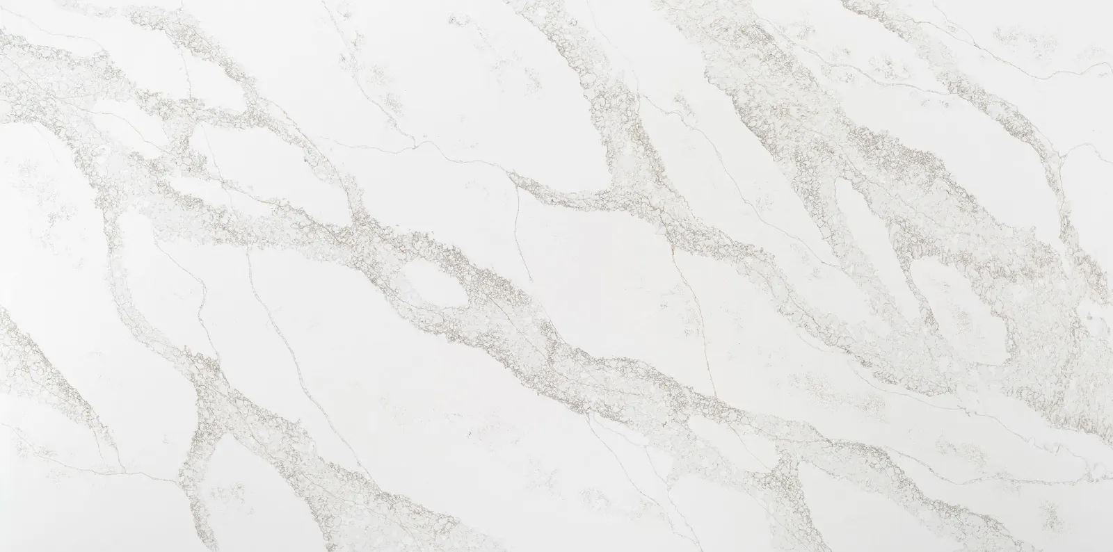 Calacatta marble-inspired quartz, featuring a bright white background with dynamic cream and taupe veining.