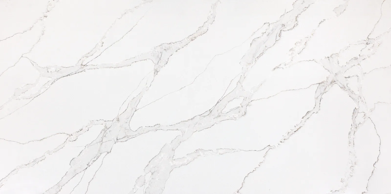 Calacatta marble-inspired quartz, featuring a white background with dynamic light grey and gold veining.