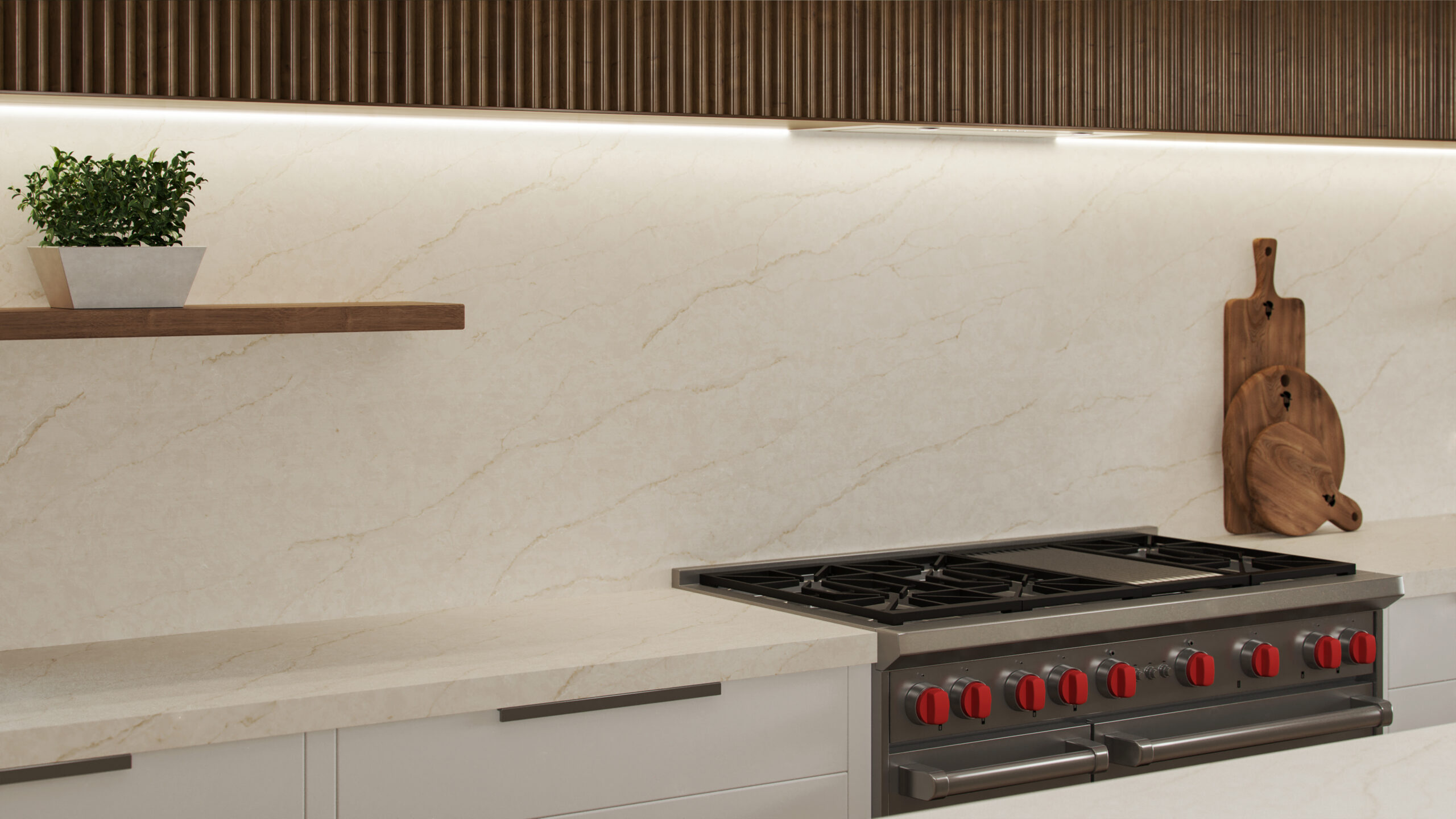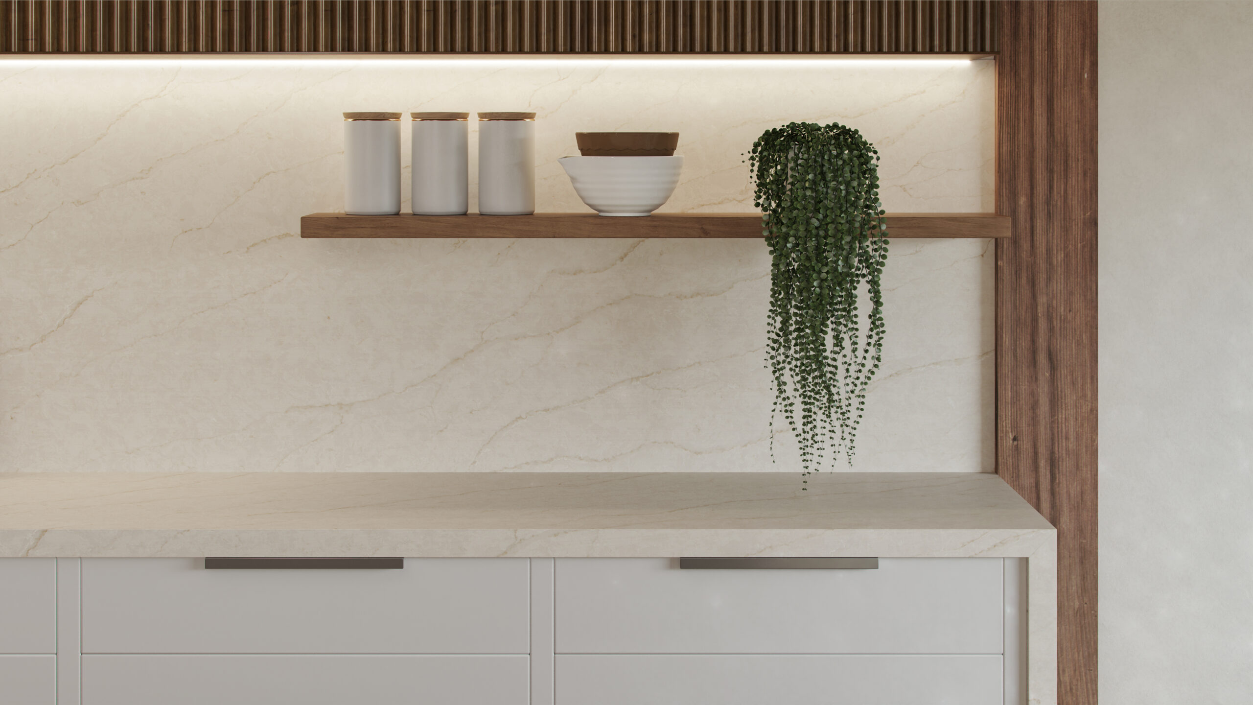 Taj Mahal quartzite-inspired quartz, featuring a two-toned beige background with beige and taupe veining.