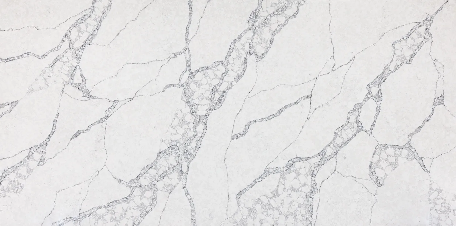 Superwhite quartzite-inspired quartz, featuring a two-toned off-white and grey background with flowing grey veining.