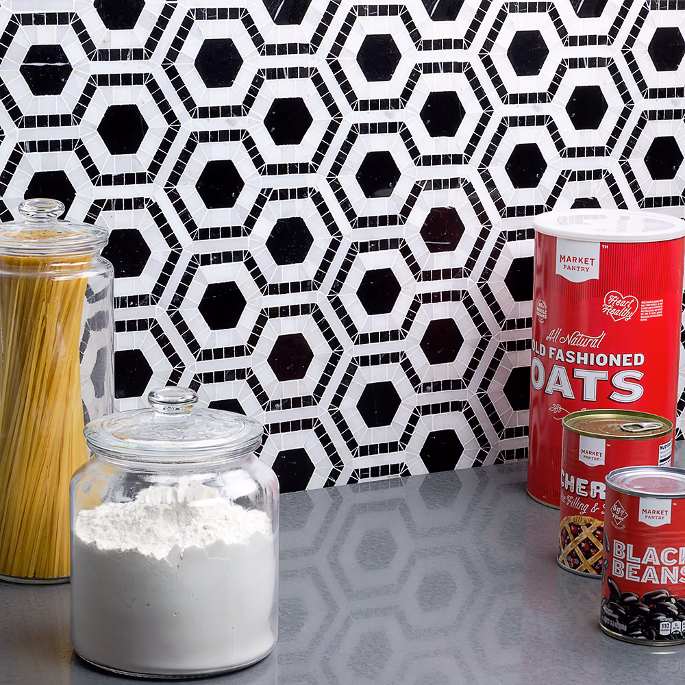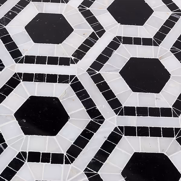Evo Hex Nero & Asian Statuary 4″ Hexagon Marble Polished Mosaic Tile